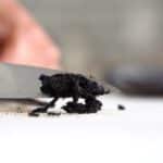 - Open the bean like a book to expose the sticky, resinous interior. Hold one end steady and use the tip of the knife to gently scrape along the inside, collecting the tiny black seeds.