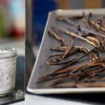 - Inspect the bean: if it is too dry it will be more challenging to extract the seeds. If too dry, the vanilla bean can be cut into pieces with a scissors and thrown into the liquid you wish to infuse. Next, mix the vanilla bean pieces with some of the liquid using a high powdered blender or an immersion blender. Pass through a sieve and save scraps to make vanilla sugar.