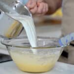 - Bring the milk back to a boil and turn off the heat. Temper the egg mixture by gradually whisking in about half of the hot milk.