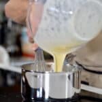 - Pour tempered egg mixture into remaining hot milk; whisking constantly.