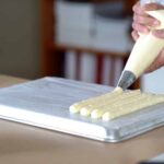 - Bake ladyfingers for 15-18 minutes. Once baked, slide over the countertop to cool.