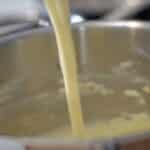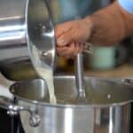 - Now, incorporate hot milk into the mashed potatoes gradually using a solid whisk. Start slowly to avoid splashing over.