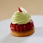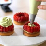 - Baked tart shells may be lightly coated with melted white chocolate to prevent from getting soggy overtime. Cut out ten 0.4-inch/1cm thick rounds out of leftover quatre quart cake or genoise. Pipe out a dollop of raspberry jam into tartlets. Soak quatre quart round quickly in the passion fruit punch and place into tartlets. Arrange raspberry halves around it. Pipe out generous matcha chantilly rosettes. Garnish with a thin slice of peach if desired.