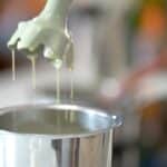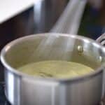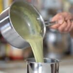- In a narrow and tall container, add the chopped white chocolate. Pour in the hot matcha liquid and let sit for a couple of minutes.