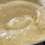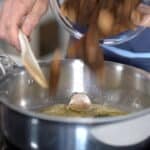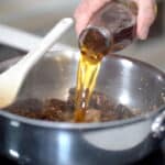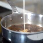 - Pour in the reserved mushroom liquid and chicken stock. Bring to a simmer and reduce the liquid by half or more.