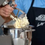 - Sift flour and baking powder together and set aside. Put butter to soften up in the microwave for a few seconds (do not melt). In the stand mixer fitted with the paddle attachment, whip butter along with the salt, sugar and vanilla until smooth. Add one egg at the time and continue to beat. If mixture happens to separate, warm up mixing bowl using a kitchen blowtorch or over a bain-marie. Beat until light and fluffy. Lower the mixer speed and add the sifted powders, and mix until homogenized.