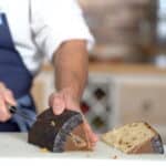 - Quarter the panettone by cutting it in half vertically and then halving each half. Slice each quarter horizontally into 3 pieces for a total of 12 slices (remove the paper mold once sliced). Note: To achieve the crispiest toast, allow the brioche slices to stale, uncovered, for 12-24 hours beforehand. This drying process is preferred for optimal texture.