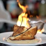 - Ladle approximately 90 grams of chilled orange crème anglaise onto a serving plate. In a small saucepan, carefully warm the rum. Ignite it to flambé. Once the flames subside, immediately pour the hot rum-raisin syrup over the panettone just before serving.