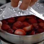 - Soak gelatin sheets in cold water to soften, and drain. Place strawberries and sugar over a bain-marie, cover with plastic wrap tight and let sweat for a couple of hours. Turn heat off and leave it to sit overnight.