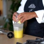 - Remove from the heat and transfer mixture to a narrow container – let cool for 10 minutes, add butter and smooth out with an immersion blender.