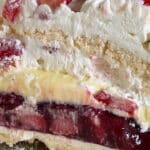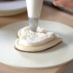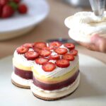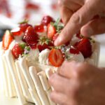 - Add more Chantilly and cover with some chopped strawberries. Spread a thin layer of Chantilly on the second meringue and flip (flat surface up).