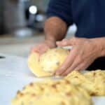 - Without using extra flour, divide the dough into three 2 lb. (900g) portions. Gently degas each piece, shaping it into a tight round before placing it into a paper panettone mold. Cover the molds loosely with plastic wrap.