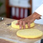 - Trim and cut genoise into 3 slices. The genoise must fit into the dressed cake.