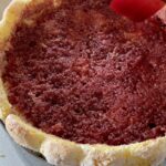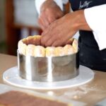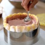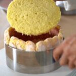 - Place the first genoise slice inside the cake ring and moisturize it with raspberry punch.