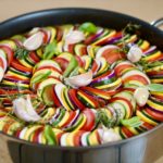 - Line baking tray with greased parchment or silicone mat and salt bottom of the tray. Overlap tomato slice, eggplant, zucchini, yellow squash – repeat 4 more times. Season with salt, thyme and crushed garlic. Refrigerate for an hour or for up to 2 days. Drizzle some olive oil, season with pepper – Top with parchment and foil and cook at 300ºF/180ºC for 30 min. Uncover and cook for 30 mins more at 350ºF/180ºC.