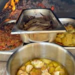 - As soon as the ratatouille is confit and ready to be served, leave it to rest for 30 minutes. Immediately so, spread embers back to the center of the oven and fire it up with a bunch of vine branches or Mesquite wood chunks. After 10 minutes or so, spread embers and grill your meat.