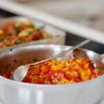 - In the large shallow roasting pan, combine the cooked tomatoes with the zucchinis. Squeeze out some of the roasted garlic in, and add more chopped basil if desired. A this juncture, the bell pepper-onion mixture can be folded into the tomato-zucchini.