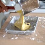 - To cool custard faster, transfer onto a frozen baking tray lined with plastic film, and cover with another sheet of plastic film in contact. Top with ice pack and refrigerate.