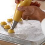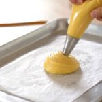 - In a separate baking tray, pipe a large 4 inch/10 cm diameter choux.