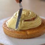 - Cover the entire cake dome with more pastry cream, and smooth out using an offset spatula. Place cake in the refrigerator.