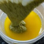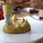 - Add dots of pistachio paste and soft raspberry or red fruit jelly, and crushed pistachios.