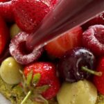 - Arrange red fruits artfully (strawberries, raspberries, cherries). Brush fruits with neutral mirror glaze if desired.