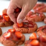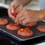 - Top each cookie with a teaspoon of strawberry caramel. Top caramel with 3 slices of strawberry. Put cookies back in the oven for 8 minutes more. Avoid any excessive coloring. These cookies are best slightly underdone.