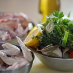- Using a large chef knife or cleaver, break apart chicken backs, wings and feet. Broken bones provide extra collagen, great body, and nutrition to the stock. Add wine in the pot first, (adding an acid, like wine, lemon to your bones and water will help extract the collagen in the connective tissue that adheres to those bones). Then add chicken parts, veggies, lemon, herbs and water.